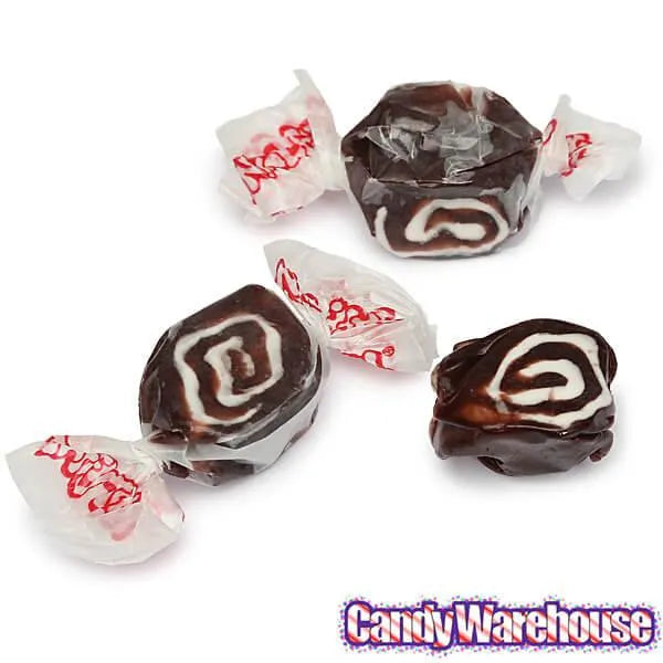 Bag contains 2.5 pounds of Black Licorice Swirl Salt Water Taffy Candy.