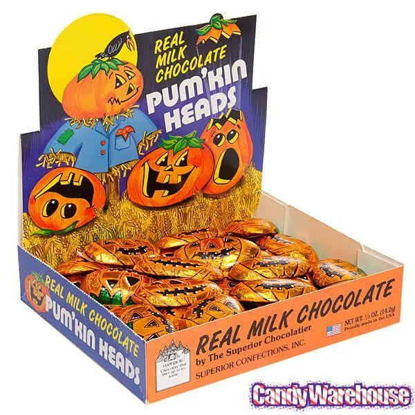 Display box contains 36 Foiled Milk Chocolate Pumpkins, each with a net weight of 0.5 ounce.