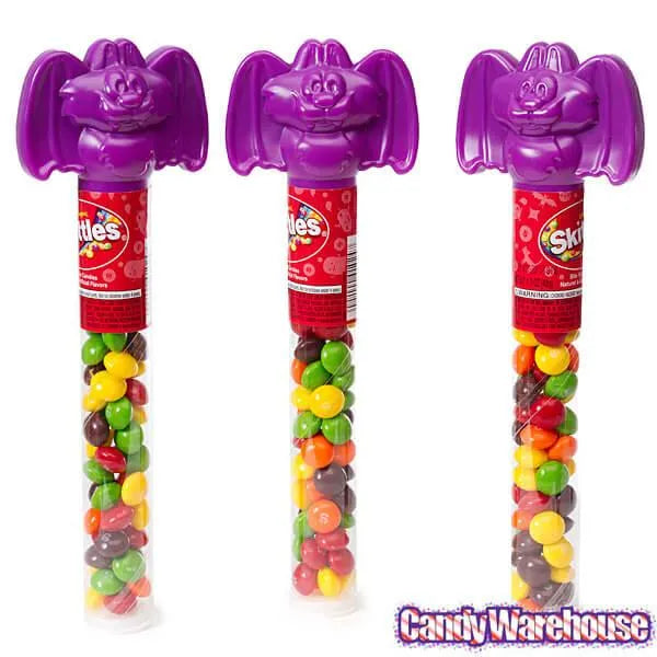 Spookify your Skittles! These festive tubes are filled with assorted fruit flavored Skittles and feature a purple bat topper.Tube Height: 9.5 InchesDisplay box includes 12 Skittles Candy Halloween Tube Toppers.Made in the USA.Shipping Weight ~ 3 lbs.