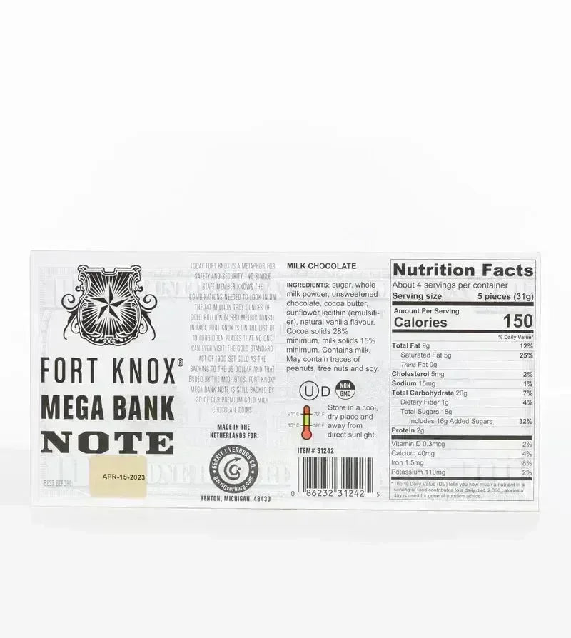Fort Knox Chocolate Bank Note: Chocolate lovers, take note! Our Fort Knox Mega Banknote package is as clever as it is delicious, filled with 20 luscious chocolate coins. Each coin is non-GMO, gluten-free, and designed to resemble a $100 bill, making it a standout in any display. Ideal for gourmet gift baskets or adding a bit of “chocolate luxury” to seasonal displays!