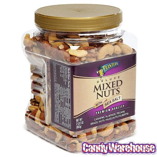 A delicious assortment of salted nuts... the perfect snack any time of day!Tub contains 34 ounces of Planters Salted Deluxe Mixed Nuts.Made in the USA.Shipping Weight ~ 2.5 lbs. Kosher Certified.