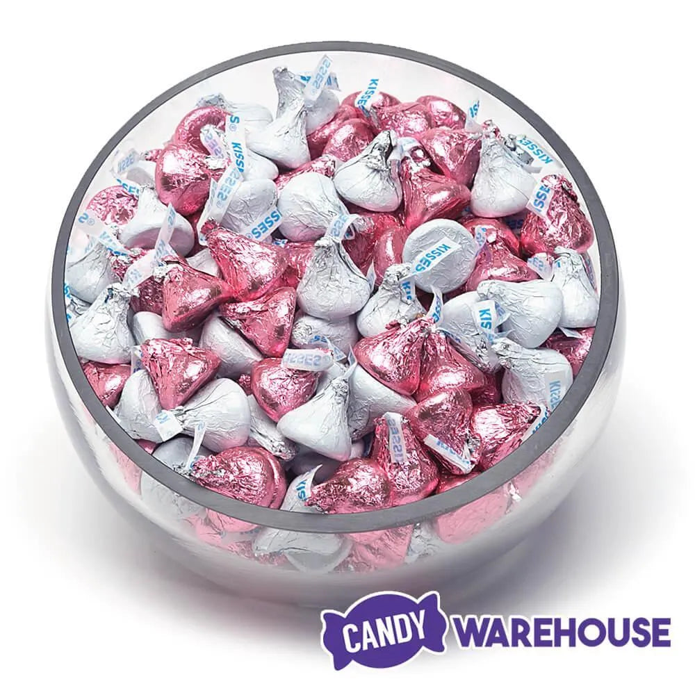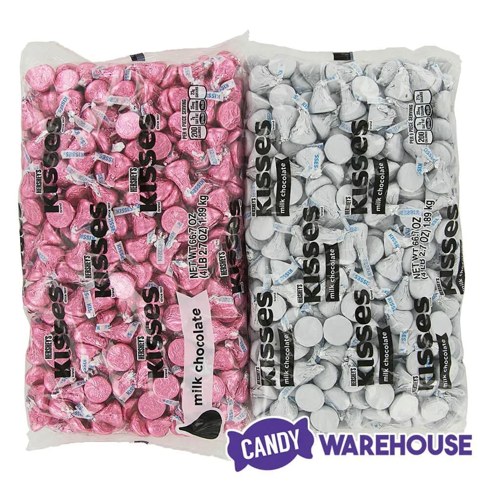 Box contains 800 pieces of Hershey's Kisses Pink Foiled and White Foiled Milk Chocolate Candy packed in two bags, each with a net weight of 66.7 ounces.