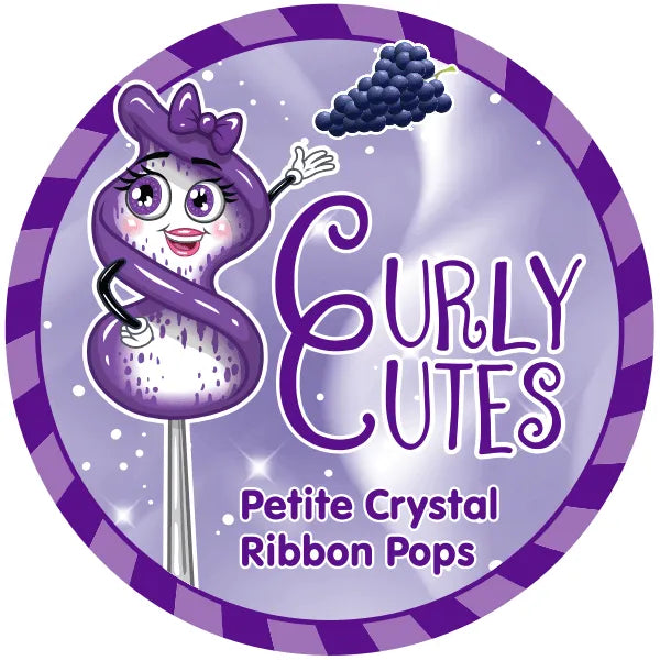 Jar contains 20 individually wrapped Purple Grape CurlyCutes Pops Petite Ribbon Lollipops.