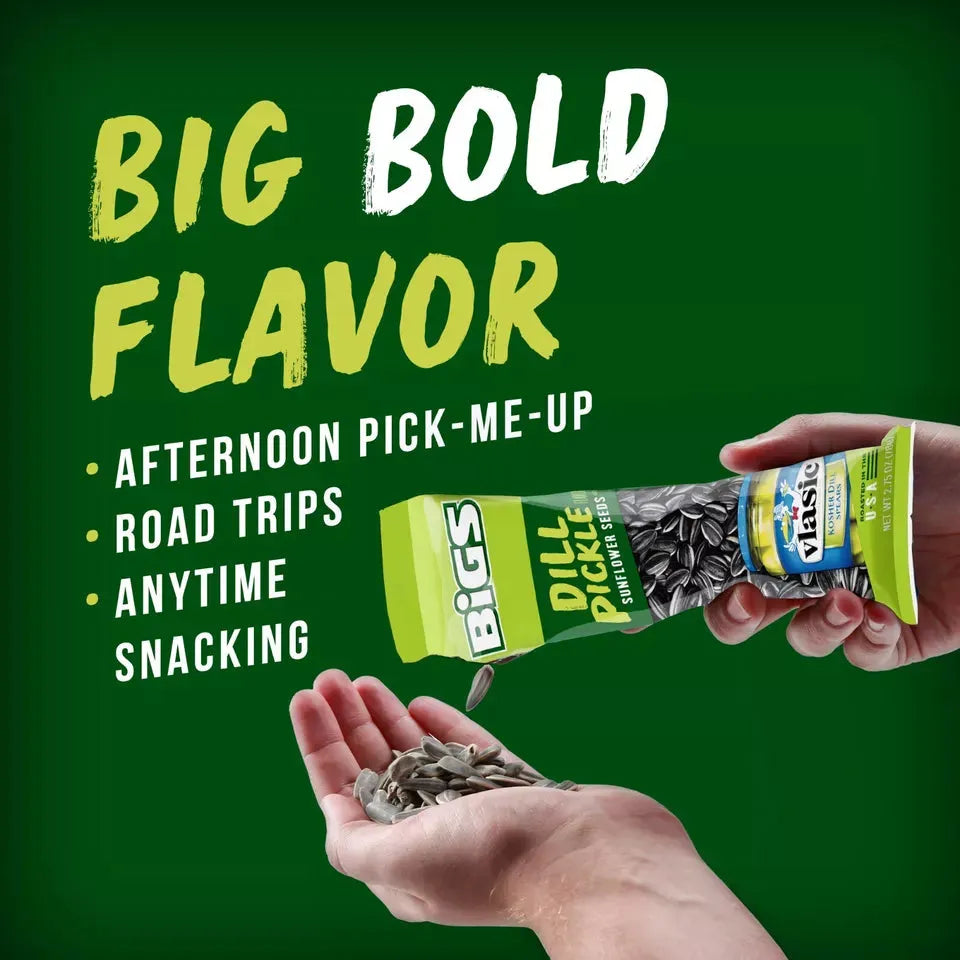 Take your sunflower seeds to the next level with BIGS Dill Pickle Sunflower Seeds! Made in collaboration with the pickle pros at Vlasic, these huge, crunchy seeds are bursting with tangy, authentic dill pickle flavor for a snack experience like no other. Packed in a convenient peg bag, they’re perfect for on-the-go munching, road trips, or game day snacking. When it comes to bold flavor, BIGS does it bigger—and dill-iciously better!