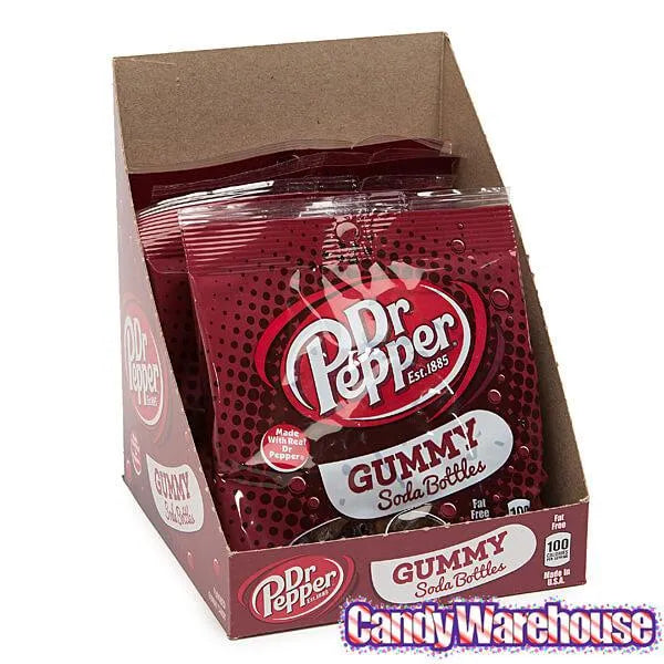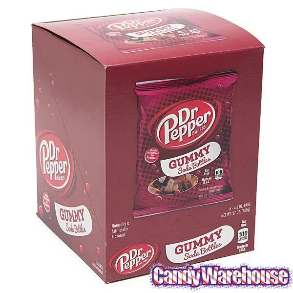 Display box contains 6 Dr. Pepper Soda Bottles Gummy Candy Bags, each with a net weight of 4.5 ounces.