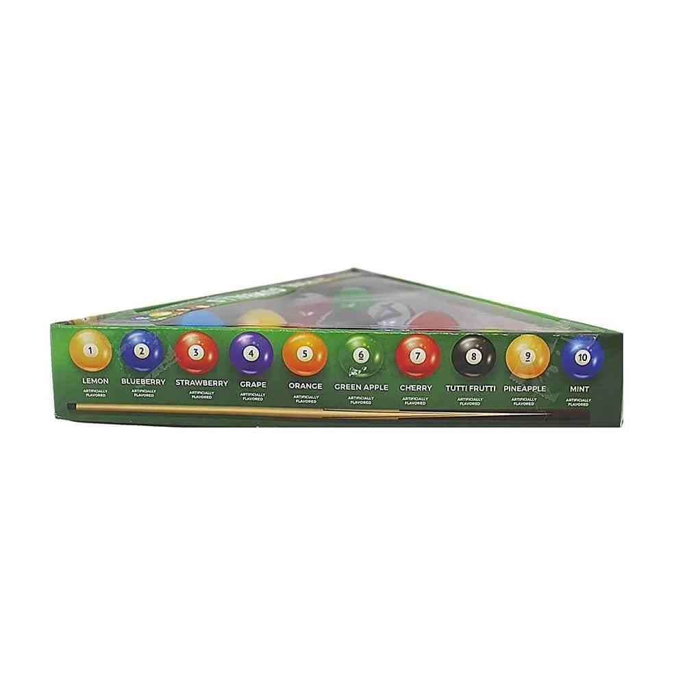 POOL gumballs come with 10 balls that look like the classic game of pool! FUN FLAVORS! 1-Lemon, 2-Blueberry, 3-Strawberry, 4-Grape, 5-Orange, 6-Green Apple, 7-Cherry, 8-Tutti Frutti, 9-Pineapple, 10-Mint.