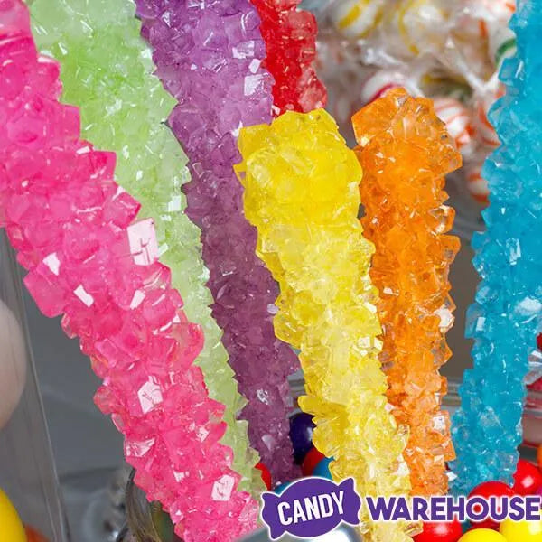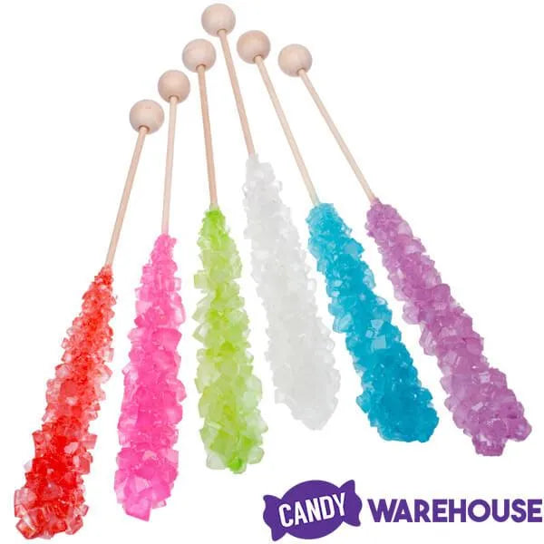 Like mighty mountainous sugar structures pushed up by tectonic shifts of the Earth's crust, these massive rock candy crystals are beautiful to behold. Bright and majestic colors emanate from these classic crystalline sugar sticks. Assortment includes six fabulous flavors-colors: