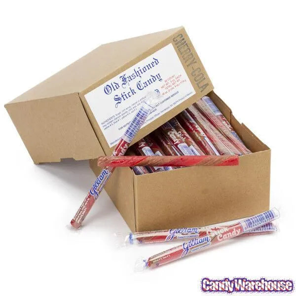 Box contains 80 wrapped Cherry Cola Gilliam Old Fashioned Hard Candy Sticks.