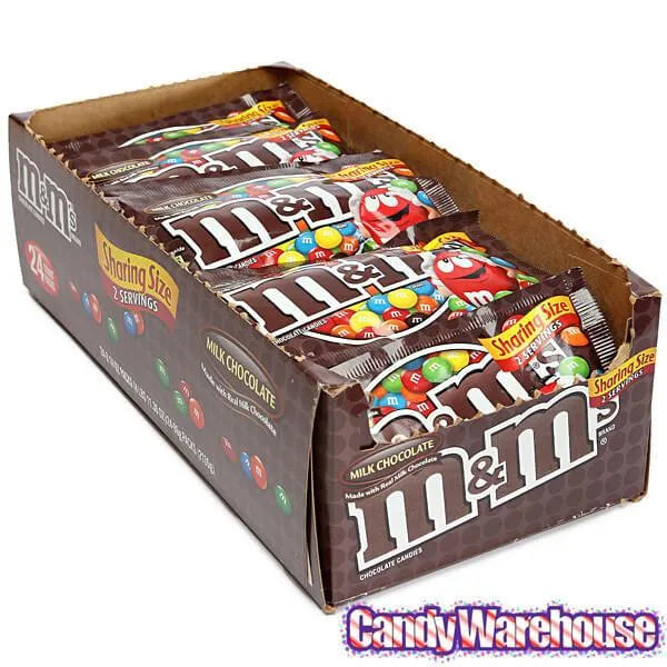 Display box contains 24 Plain M&M's Candy Packs, each with a net weight of about 3 ounces.