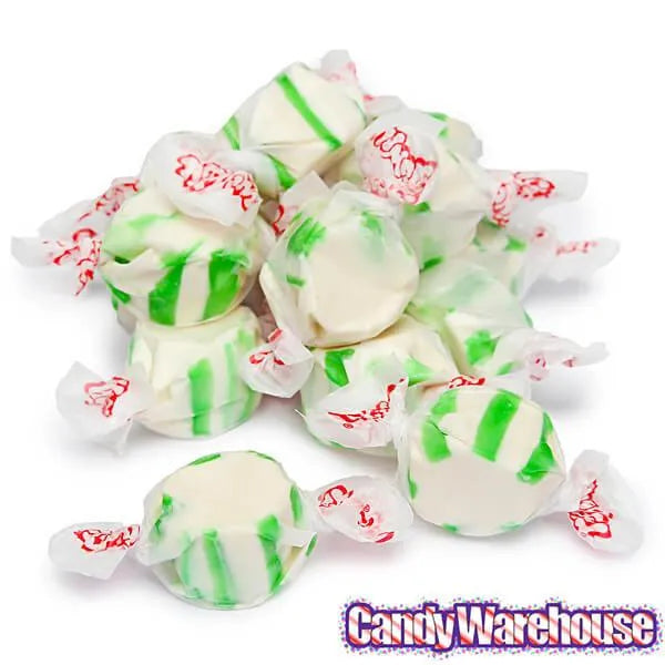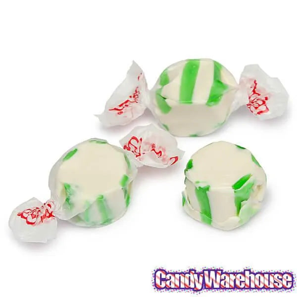 Bag contains 2.5 pounds of Gourmet Spearmint Salt Water Taffy Candy.