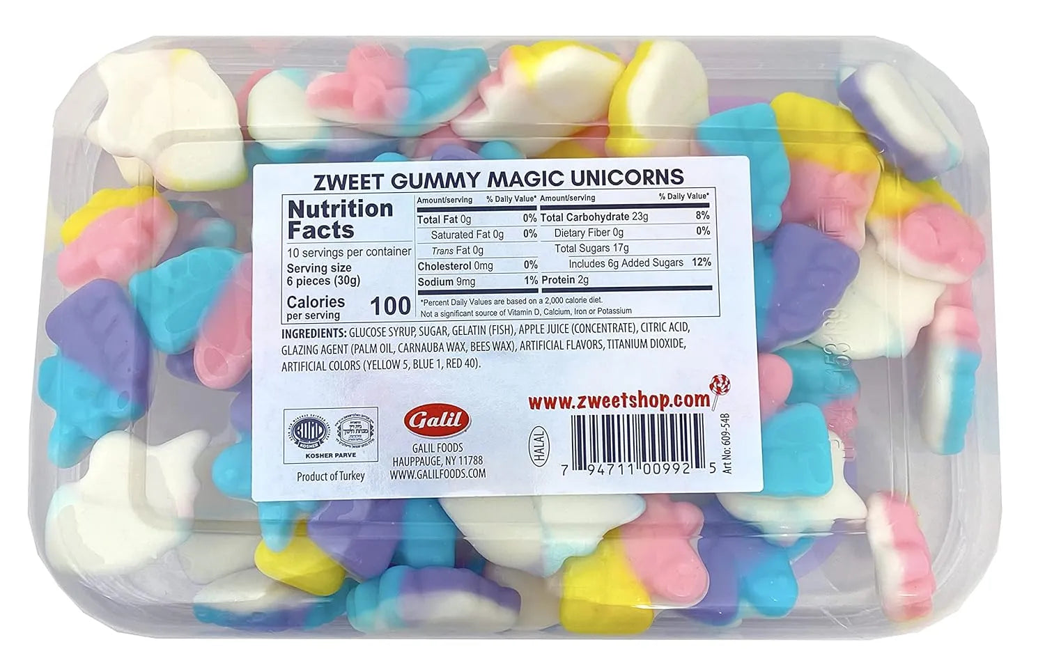 Each tub of Zweet Gummy Unicorns offers a magical, fruity adventure in every bite.