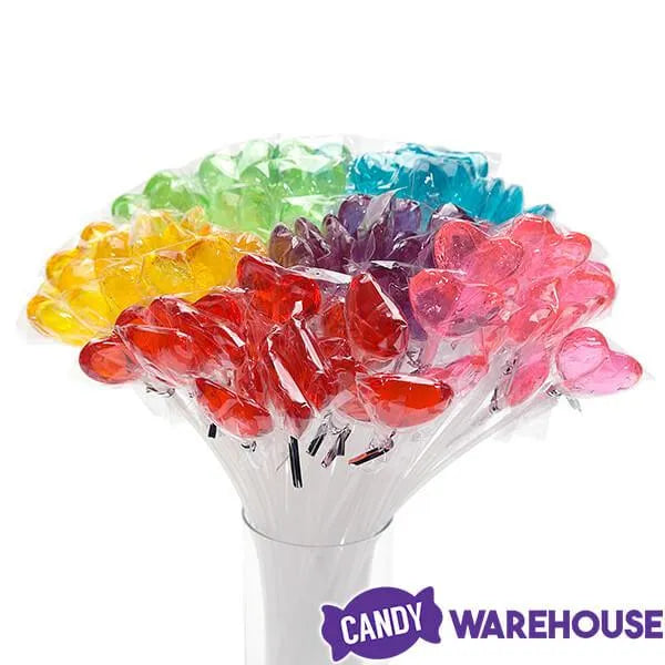 Bag contains 100 Assorted Colors Heart-Shaped Hard Candy Lollipops.