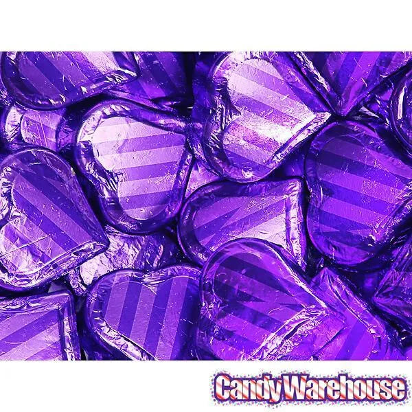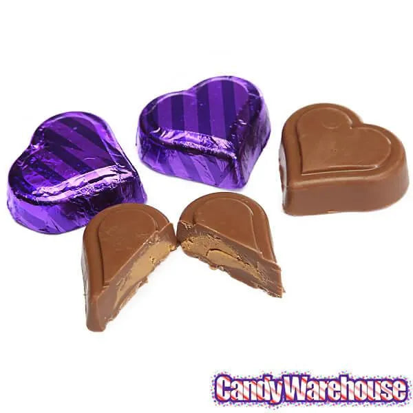 Rich milk chocolate molded hearts, filled with smooth peanut butter, and covered in deep purple and lavender foil.