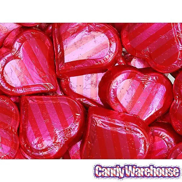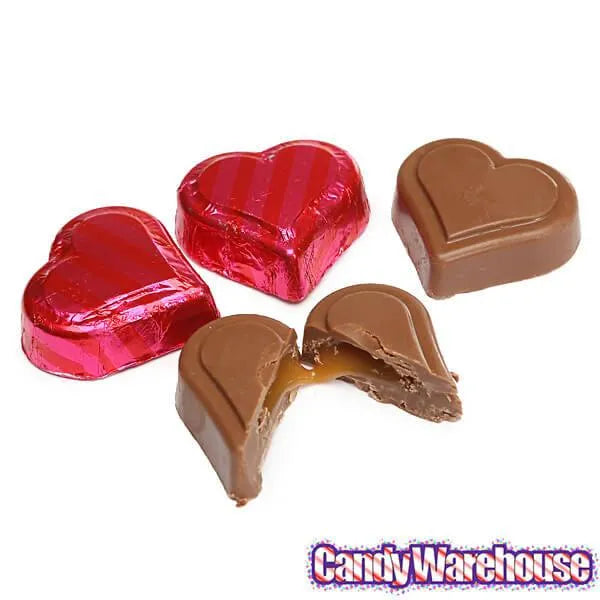 Rich milk chocolate molded hearts, filled with creamy caramel and covered in red and pink striped foil.