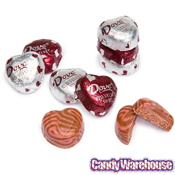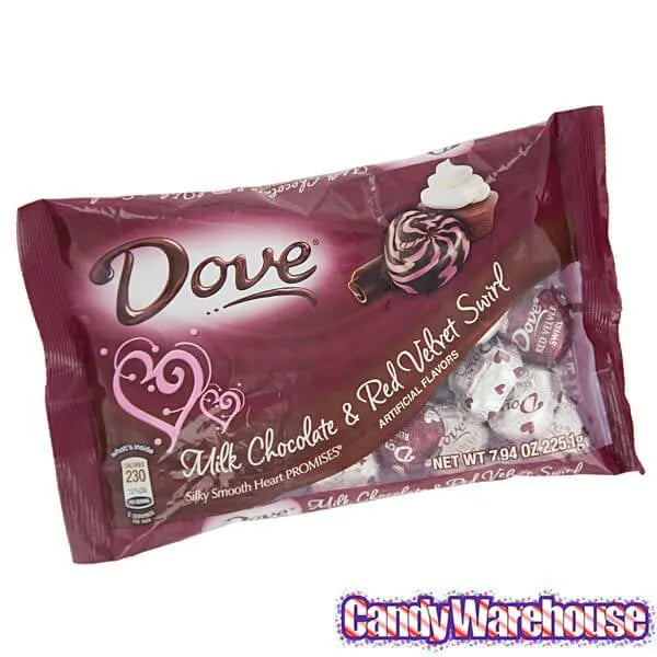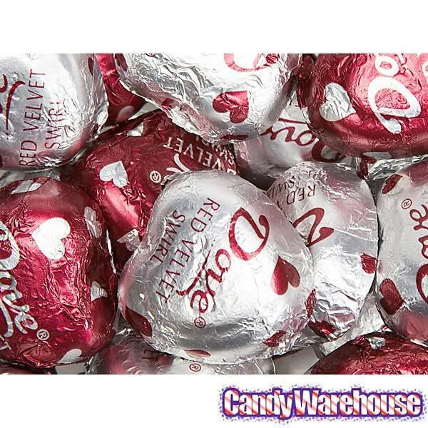 Bag contains 7.94 ounces of Dove Milk Chocolate and Red Velvet Swirl Foiled Valentine Hearts... that's about 30 pieces.