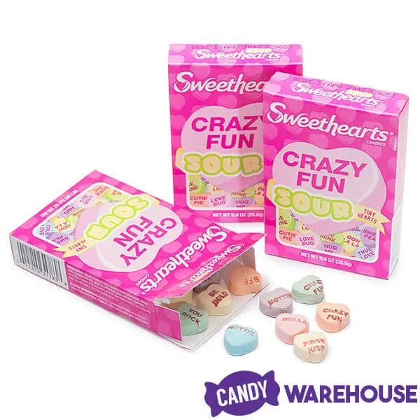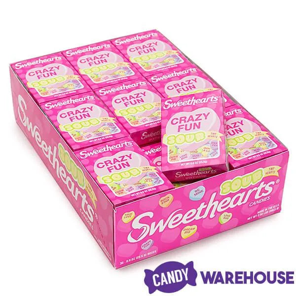 Display box contains 36 Sour Flavors Necco Sweethearts Tiny Conversation Candy Hearts Packs, each with net weight of 1 ounce.