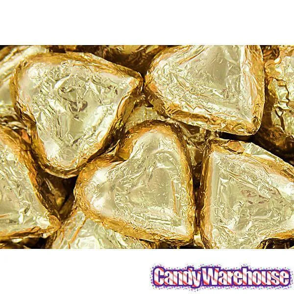 Bag contains 5 pounds of Gold Foil Wrapped Milk Chocolate Hearts Candy.
