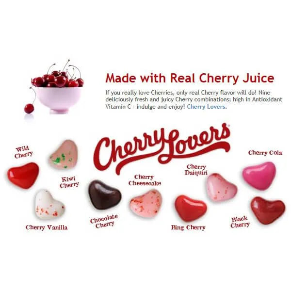 Cherry Lovers fruit chews are made with Real Cherry Juice and are High in Antioxidant Vitamin C. Feel good about every bite. Who knew there were so many ways to enjoy Cherry? With Cherry Lovers’ nine juicy combinations of cherry flavors, life’s indeed a bowl of cherries! These delicious jelly beans in the shape of hearts are featured in the following fabulous flavors: Bing Cherry, Cherry Cheesecake, Cherry Daiquiri, Chocolate Cherry, Cherry Cola, Cherry Vanilla, Black Cherry, Wild Cherry, and Kiwi Cherry.