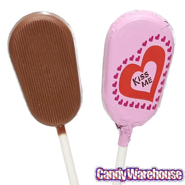 Solid milk chocolate lollypops covered in 7 different happy Valentine foil designs (heart, love, cupids, and bumble bees).