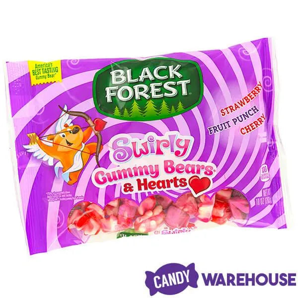 Bag contains 10 ounces of Black Forest Swirly Gummy Bears and Hearts Candy.