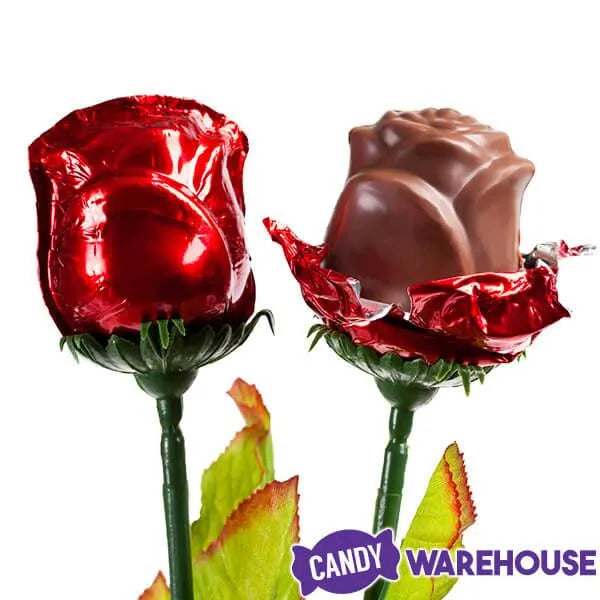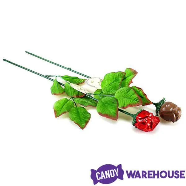 What says "I Love You." more than a bouquet of a dozen red roses? A chocolate roses bouquet of course! The ultimate combination of things most women love is bundled into this one perfect gift! Looking like the real flowers, each semi-solid molded milk chocolate rose is covered in bight red foil, nestled in silk leaves atop a graceful 14 inch green stem. And of course there are no thorns on these chocolate roses!