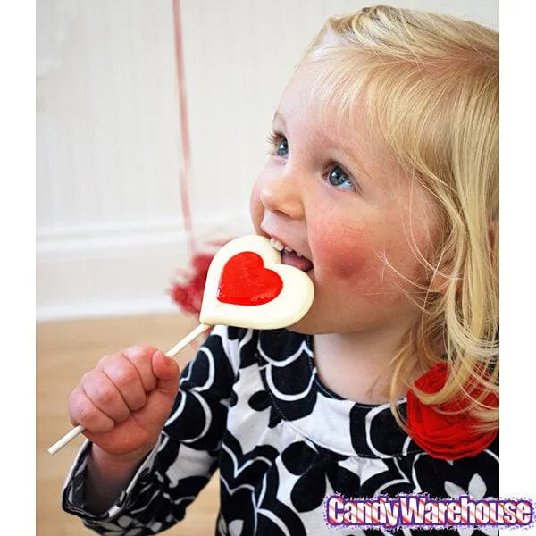Handcrafted from premium ingredients, these exquisite heart-shaped, hard candy suckers feature a sweet vanilla flavored white base and a delicious red cherry heart center. Double the hearts, double the love. Perfect for decorating at weddings or Valentine's Day events.