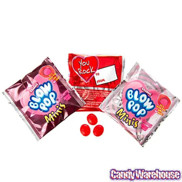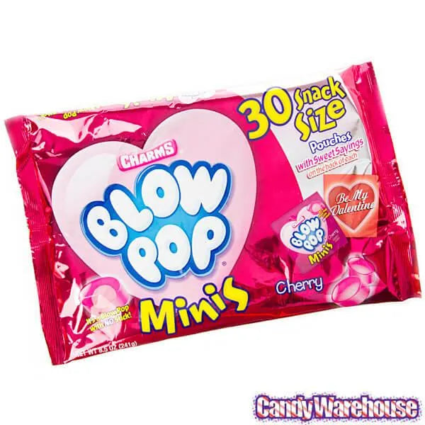 Bag contains 30 snack size packs of Charms Valentine Blow Pop Minis.