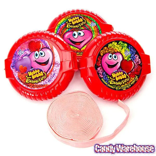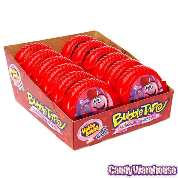 Yummy original flavor Hubba Bubba bubblegum tape packed in romantic red plastic dispensers featuring a happy smiling heart. An ideal Valentine's Day treat!Display box contains 12 Valentine Hubba Bubba Bubble Tape Gum Rolls.Shipping Weight ~ 3 lbs.