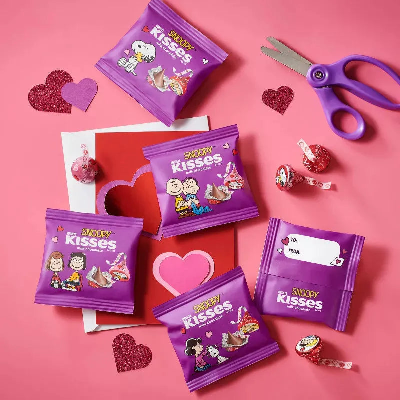 Celebrate Valentine’s Day with a touch of nostalgia and sweetness with HERSHEY'S KISSES Snoopy and Friends Milk Chocolate Candy! This 20.5-ounce Friend Exchange bag includes 32 individually wrapped sachets, each filled with creamy, bite-sized milk chocolates wrapped in festive pink and red Snoopy-themed foils. Perfect for sharing with friends, classmates, and loved ones, these treats are ideal for candy dishes, gift bags, or Valentine’s cards. Whether you’re stocking up for a party, adding sweetness to lunch boxes, or decorating baked goods like cookies and cupcakes, these delightful chocolates are guaranteed to spread love and smiles. Sweeten your celebrations with Snoopy and friends!